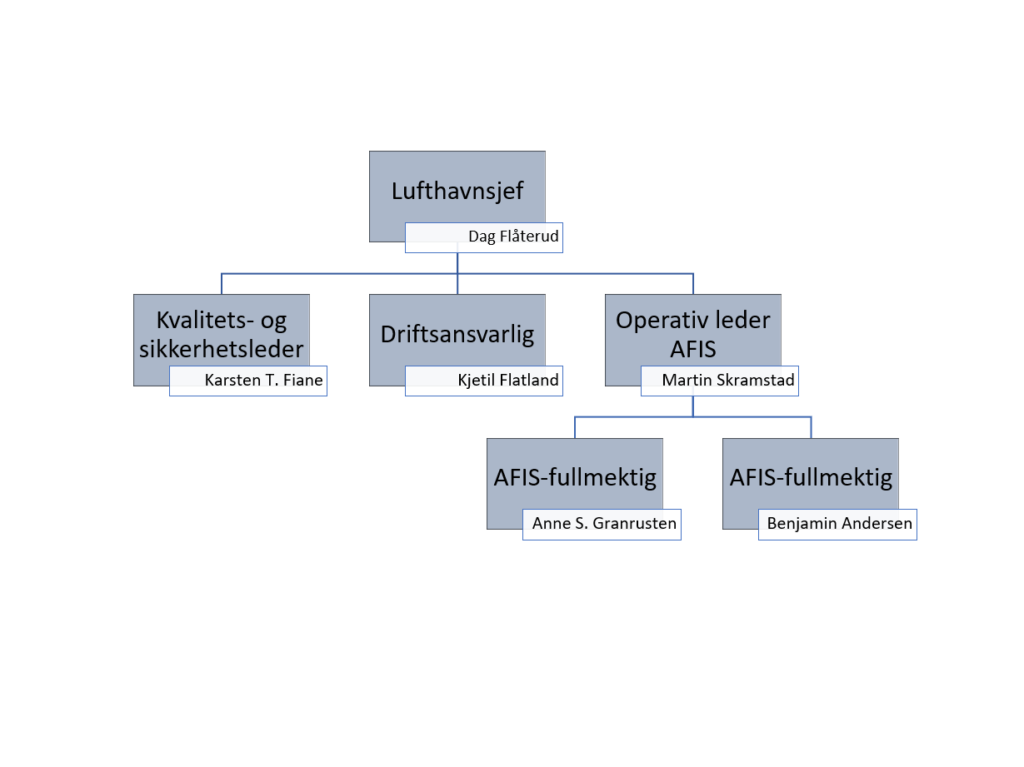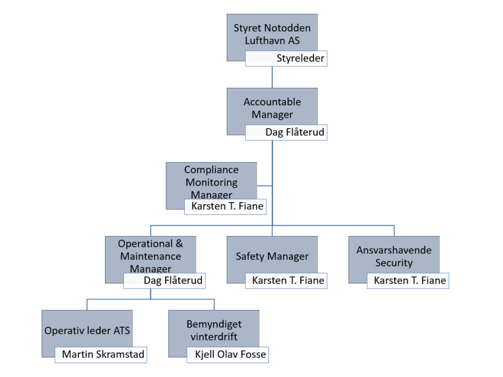 Lufthavnoperatør og tjenesteleverandør skal for ansvarlige personer med ledelsesfunksjoner innen fagområdene kvalitet, sikkerhet, økonomi og menneskelige ressurser spesifisere hvem som er tildelt myndighet, (overordnet) oppgaver og ansvar.